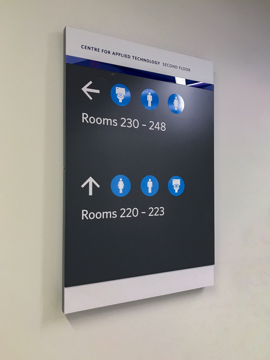 Our role involved working collaboratively with NAIT, Clark Builders, and the consultant in providing our expertise regarding product design, functionality, and suitability. Samples and prototypes were developed, followed by the creation of shop drawings, fabrication, and installation. Additions to the interior signage continued throughout the project, including signage for all of the restaurants in the food court. Site meetings were held to view installed mockups of the wall graphics and frosting film to determine the most visually appealing options, factoring in privacy requirements and light diffusion.