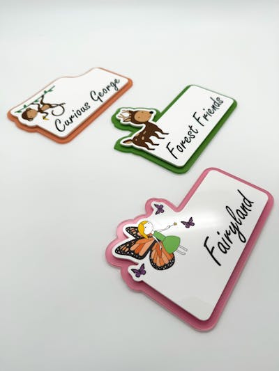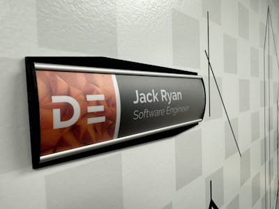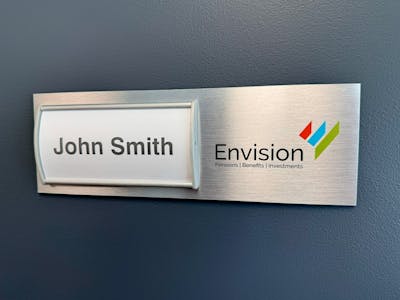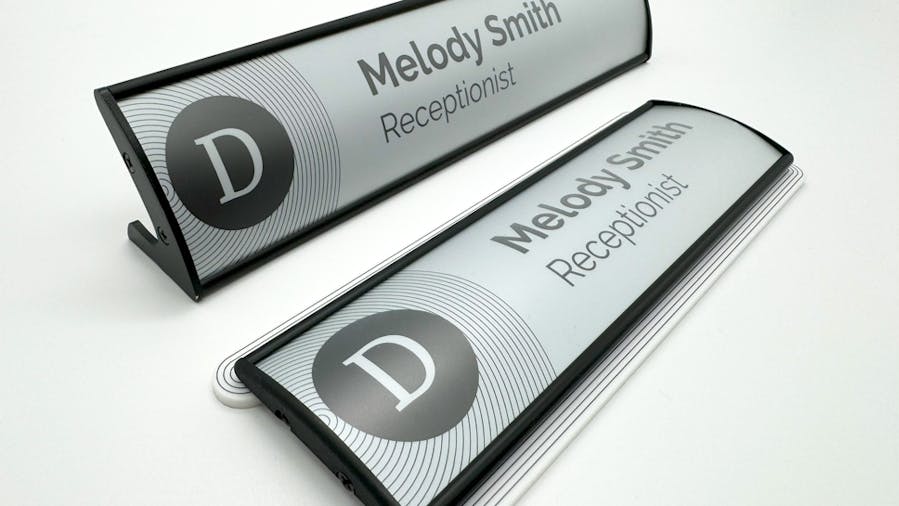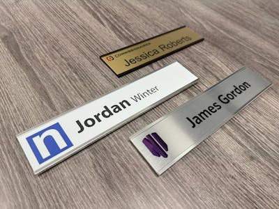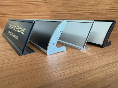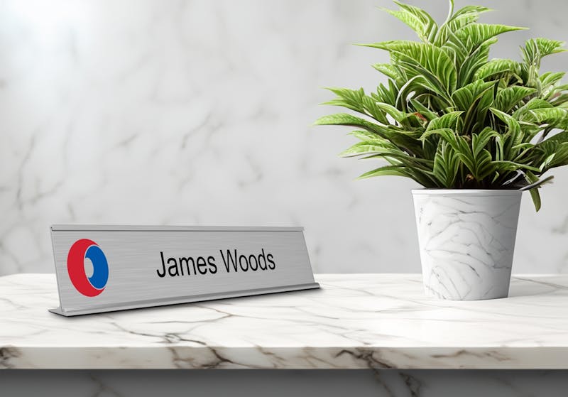 Available in both standardized and custom sizes, our name plates offer ample space for names and titles, as well as logos and graphics. By choosing a color palette that complements your company branding or office décor, we ensure that our name plates add a touch of sophistication to your space. Vibrant and full color options create eye-catching displays, while our wide selection of high quality material choices offer endless and unique design possibilities.