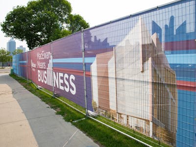 Hoarding graphics are large format graphics or signage installed on construction hoarding, temporary barriers, or fencing. They are commonly used to cover construction sites and can display project and trades details, advertisements, branding, or informative messages.